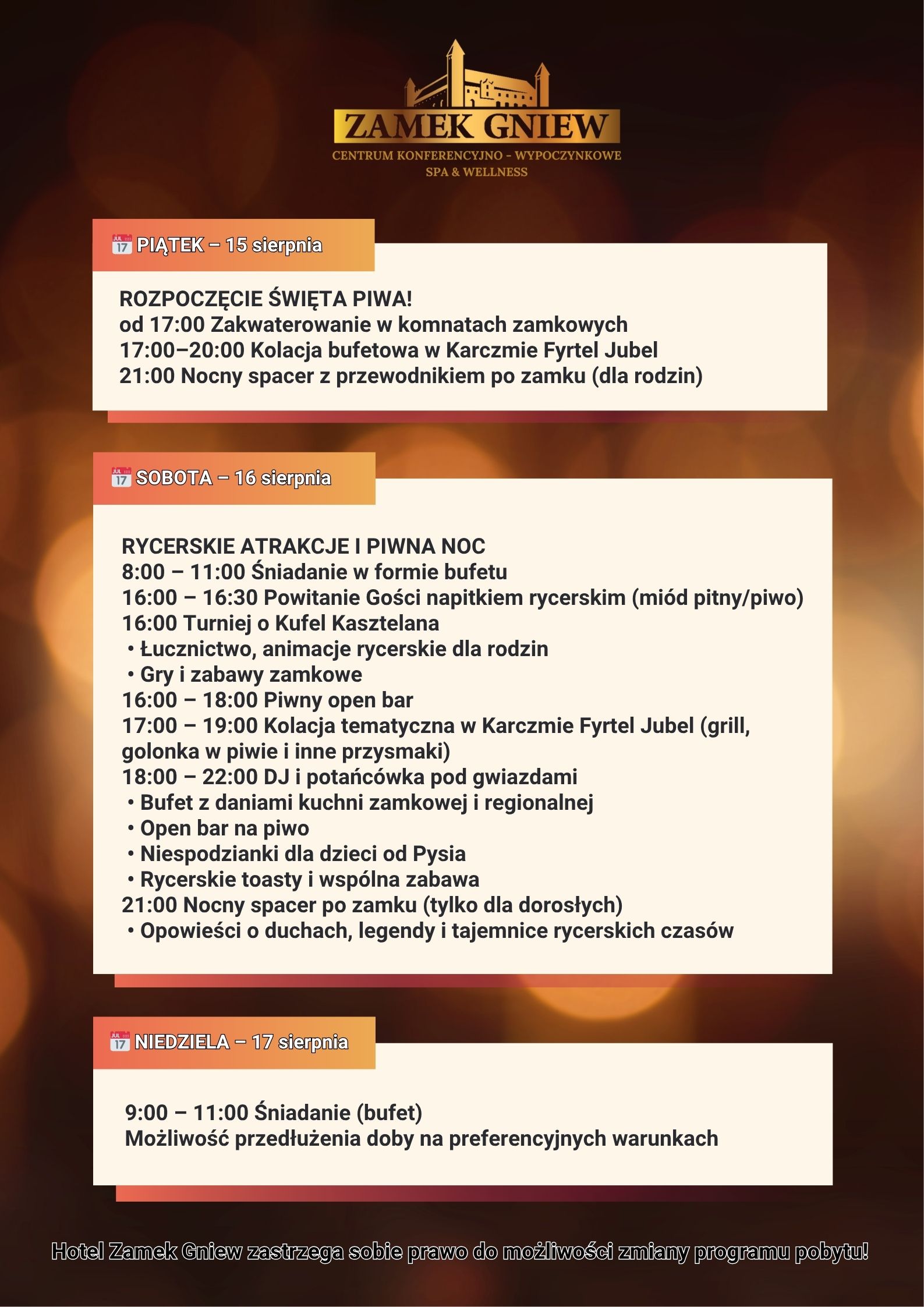 Hotel Zamek Gniew zastrzega sobie prawo do możliwości zmiany programu pobytu!